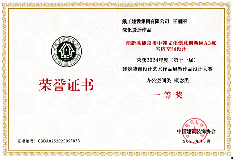 榮譽加身,砥礪前行。未來,戴工建設集團將以此次獲獎為契機,繼續(xù)深耕建筑裝飾領域,持續(xù)激發(fā)設計創(chuàng)新活力,提升工程施工品質(zhì),為客戶打造更多兼具功能性與藝術(shù)性的優(yōu)質(zhì)項目,為推動建筑裝飾行業(yè)的高質(zhì)量發(fā)展貢獻力量!